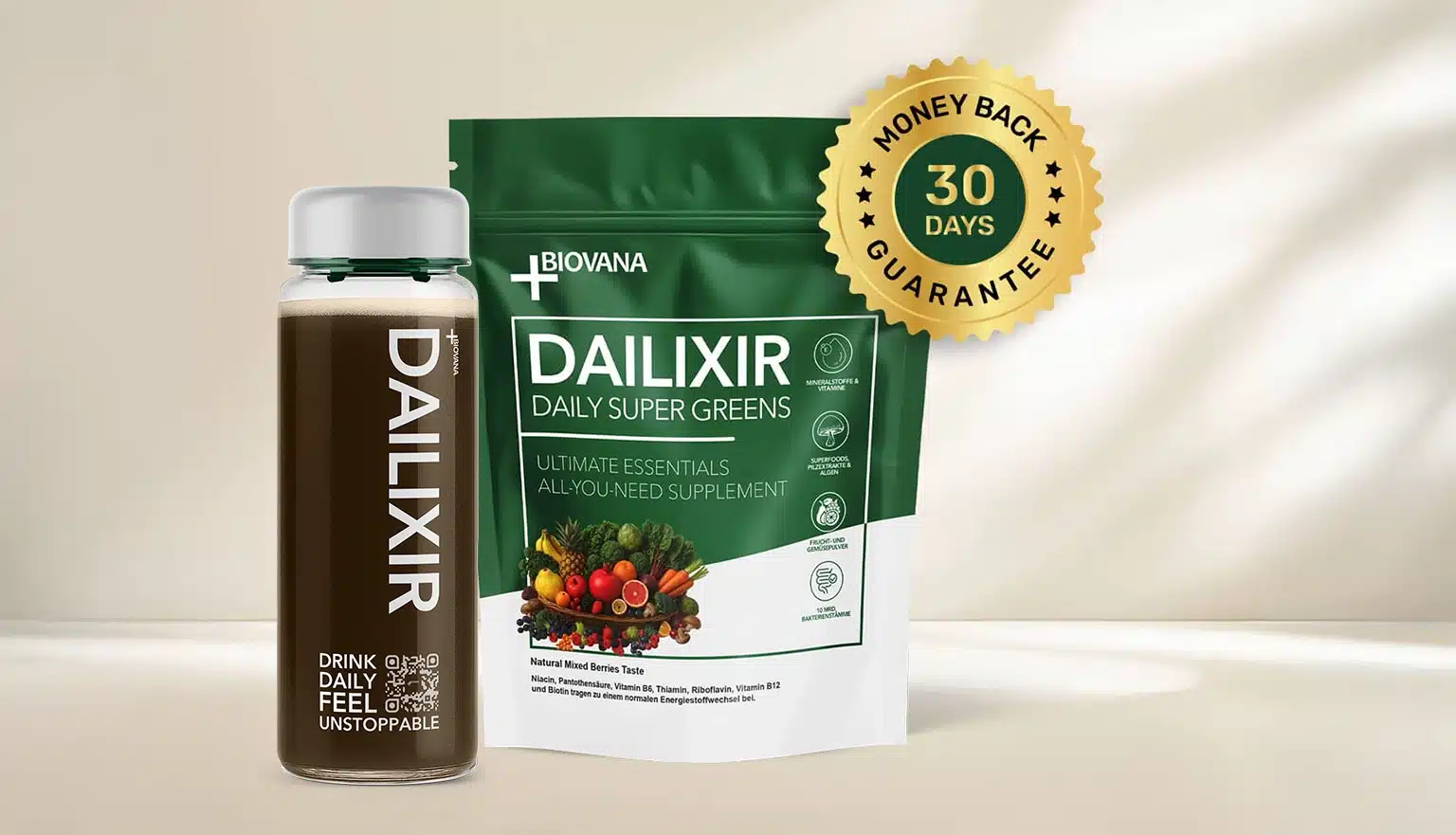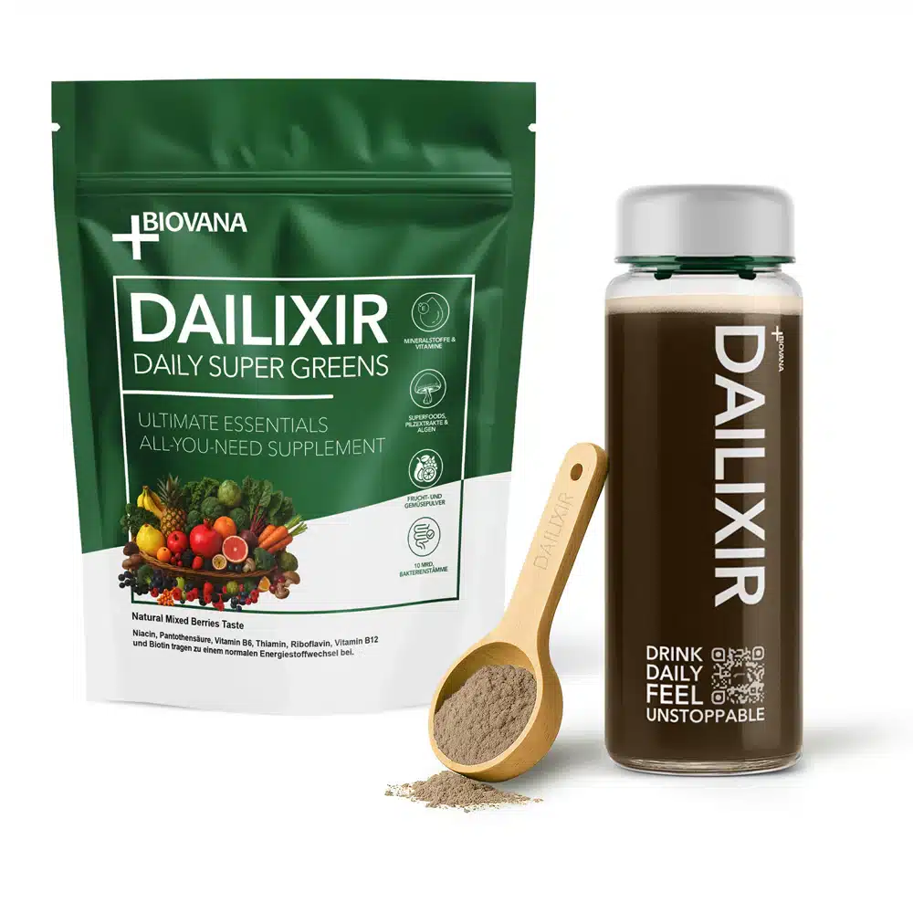Dailixir ist die unkomplizierteste Lösung gegen versteckte Nährstoffdefizite – ganz ohne Pillen, ganz ohne Aufwand. – inklusive aller relevanten Vitamine, Mineralstoffe, Pflanzenstoffe und Probiotika. Ideal für Menschen, die im Alltag funktionieren müssen, ohne sich um jedes Detail der Ernährung zu kümmern.